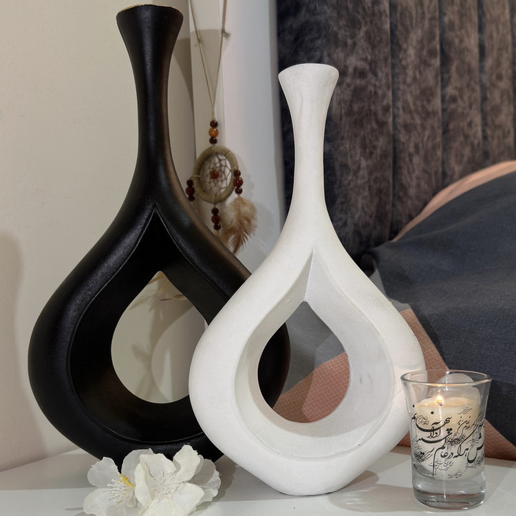 گلدان دکوری مدل اشکی در رنگ بندی سفید و مشکی که گلدان بزرگ مشکی و کوچک تر سفید توسط دست های هنر دوستان ساخته و رنگ شده است. همچنین اندازه مدل بزرگتر به طول 28/5 و عرض 18 و مدل کوچکتر به طول 24 و عرض 14 سانت میباشد. جنس این دکوری پلی استر بوده که مناسب هر فضایی در منزل و محل کار و یا کادویی مناسب برای هدیه دادن میباشد.