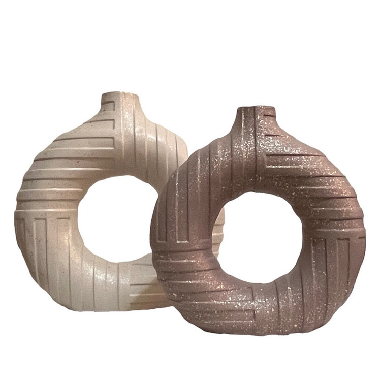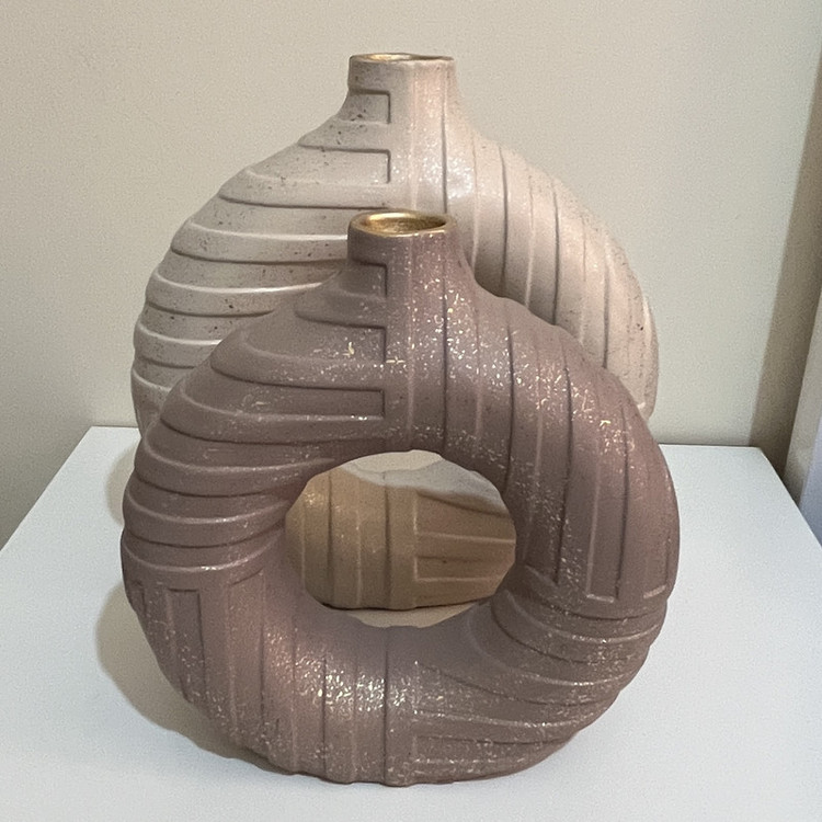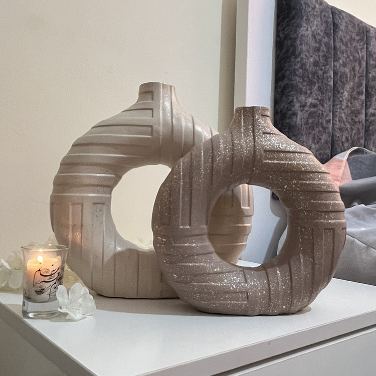 گلدان دکوری مدل 2 تیکه در دو رنگ متفاوت و مکمل یکدیگر که دارای کروم طلایی بوده که زیبایی خاصی به کار بخشیده است. اندازه کلدان بزرگ ارتفاع آن 26 و عرض 25 سانت که رنگ آن کرم مایل به صورتی و اندازه گلدان کوچکتر ارتفاع آن 22 و عرض 21 سانت که رنگ آن کالباسی میباشد. جنس کار پلی استر بوده و متناسب با هر نوع دکوراسیون تهیه و هدیه مناسبی برای کادو دادن میباشد.