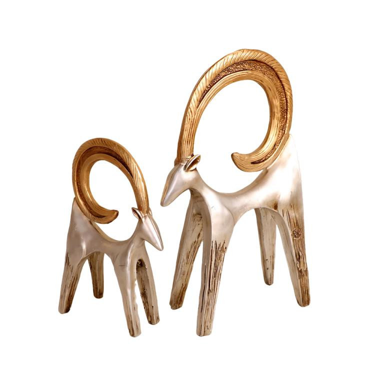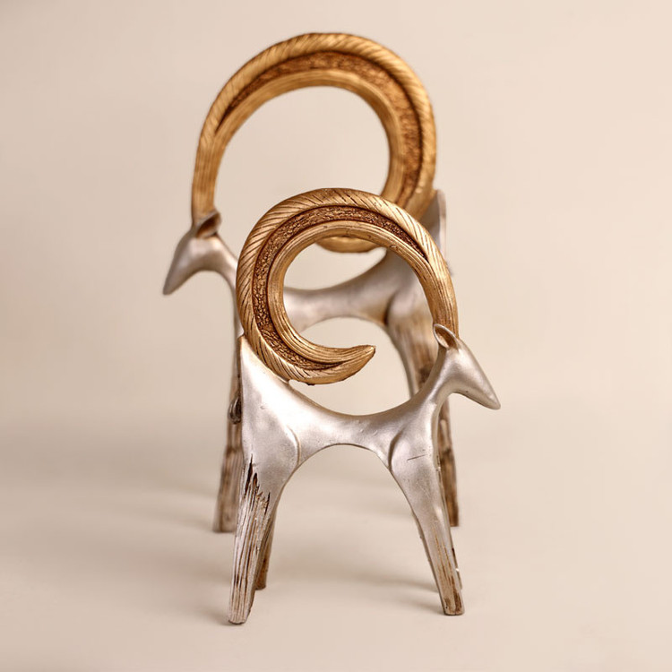 دکوری کاپرا طلایی نقره ای 2 تایی که مجسمه بزرگ: طول:21cm، عرض:11cm و ارتفاع:37cm و مجسمه کوچک: طول:17cm، عرض:7cm و ارتفاع26cm می باشند.