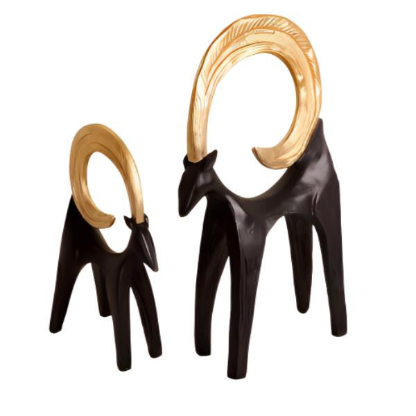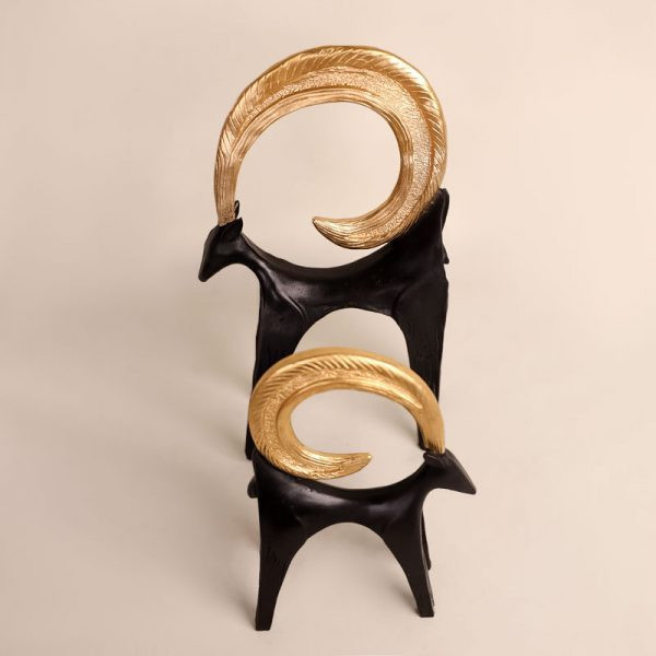 دکوری طرح کاپرا مشکی طلایی 2 تایی از جنس پلی استر که سایز مجسمه بزرگ: طول:22cm و عرض:10cm و ارتفاع:36cm و سایز مجسمه کوچک: طول:17cm، عرض:8cm و ارتفاع:26cm می باشند.
