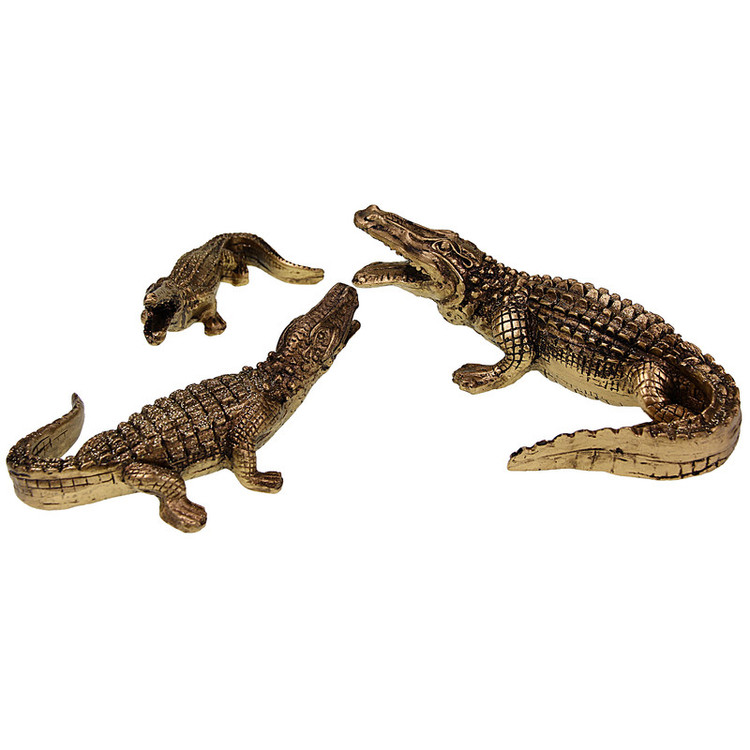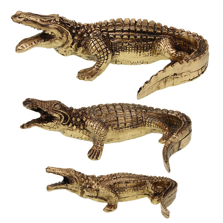 مجسمه طرح تمساح مجموعه سه عددی شامل سه مجسمه تمساح بزرگ، متوسط و کوچک به رنگ طلایی و شیک و زیبا می باشد و جهت دکوراسیون اتاق پذیرایی و آشپزخانه کاربرد دارد
