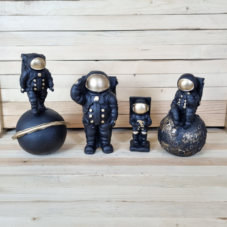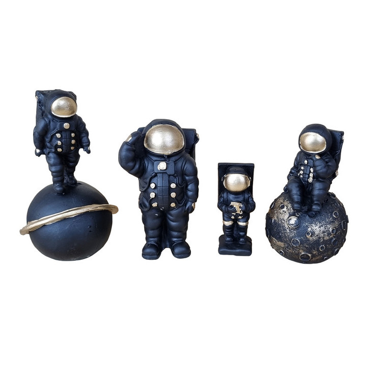مجسمه طرح فضانورد مجموعه 4 عددی شامل 4 عدد مجسمه در طرح های مختلف می باشد که به ابعاد 10x10x20 و 13x13x24 و 5x8x19 و 11x11x14 و به ترتیب به وزن های 360 و 430 و 330 و 160 گرم می باشد.