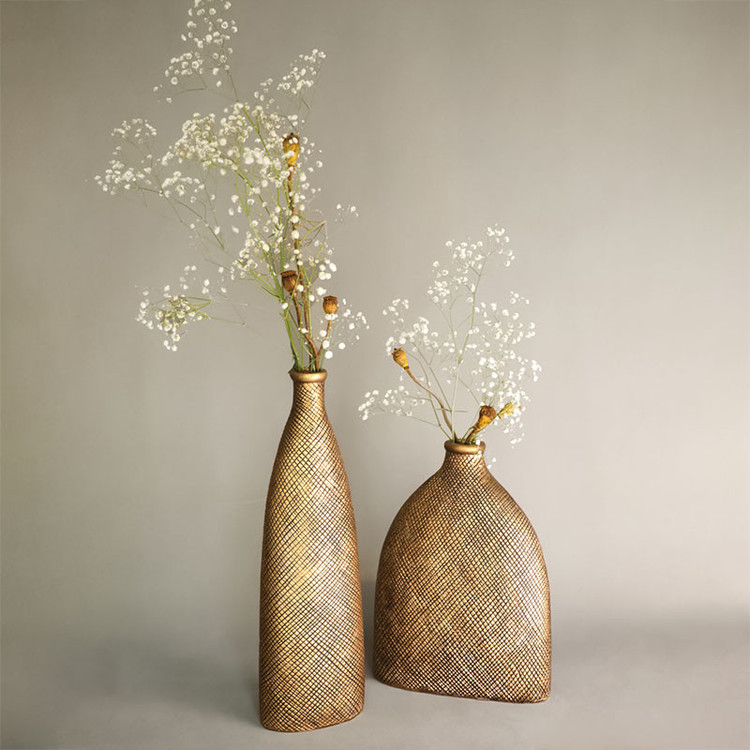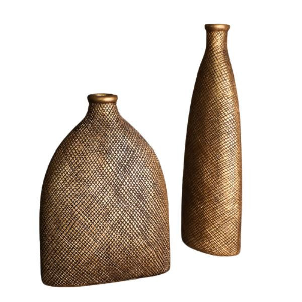 گلدان تندیس طلایی 2تایی که سایز گلدان بزرگ: طول:32cm، عرض:8cm و ارتفاع:38cm و سایز گلدان کوچک: طول:32cm، عرض:15cm و ارتفاع:34cm می باشند.